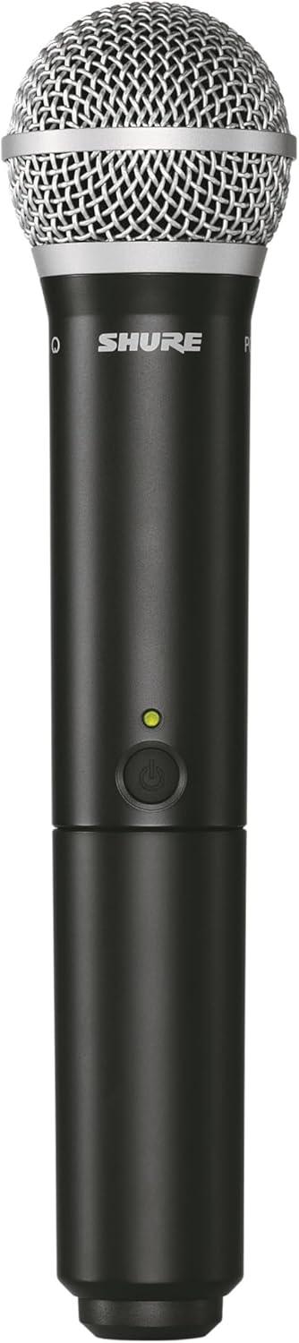 WHAT'S IN THE BOX – BLX4 single-channel receiver, power supply, BLX2 handheld wireless transmitter with integrated PG58 vocal microphone capsule, mic clip, 2x AA batteries, and user guide.