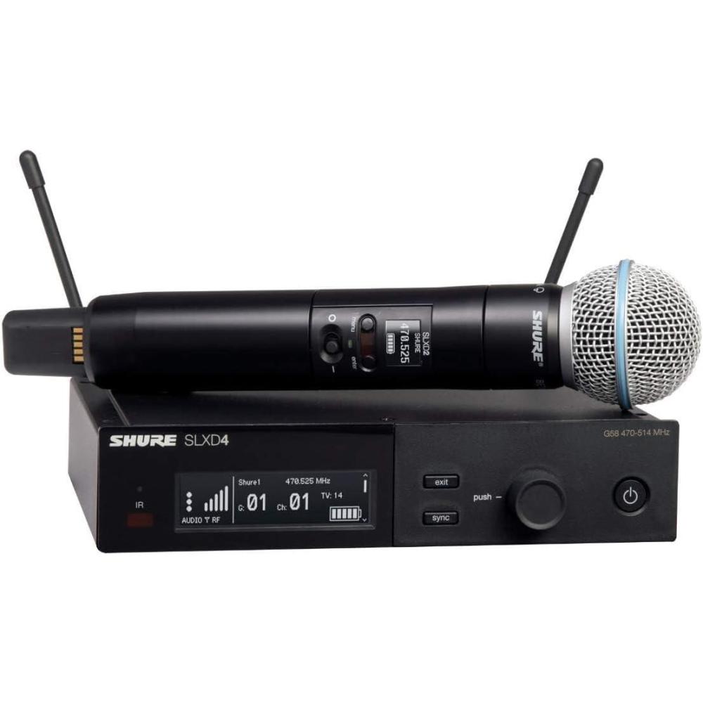 WHAT'S IN THE BOX: (1) SLXD2 handheld transmitter with the Beta 58A supercardioid dynamic microphone capsule and (1) SLXD4 single-channel receiver with antenna and rackmount accessories, (1) zippered bag and (2) AA batteries