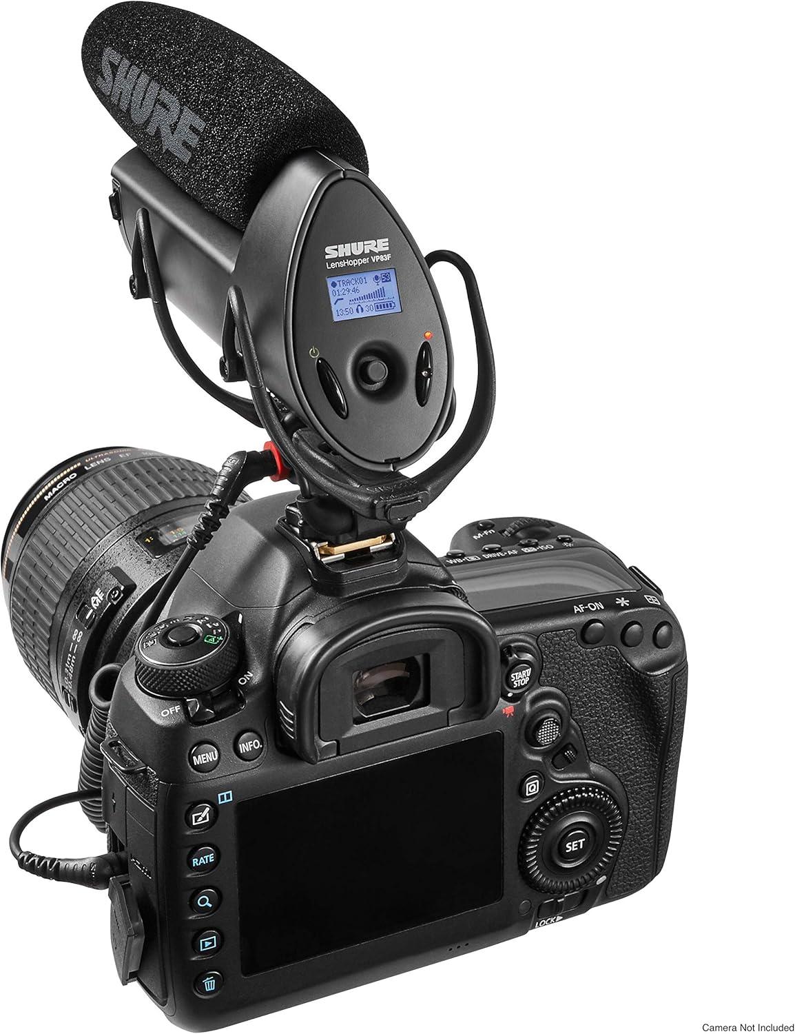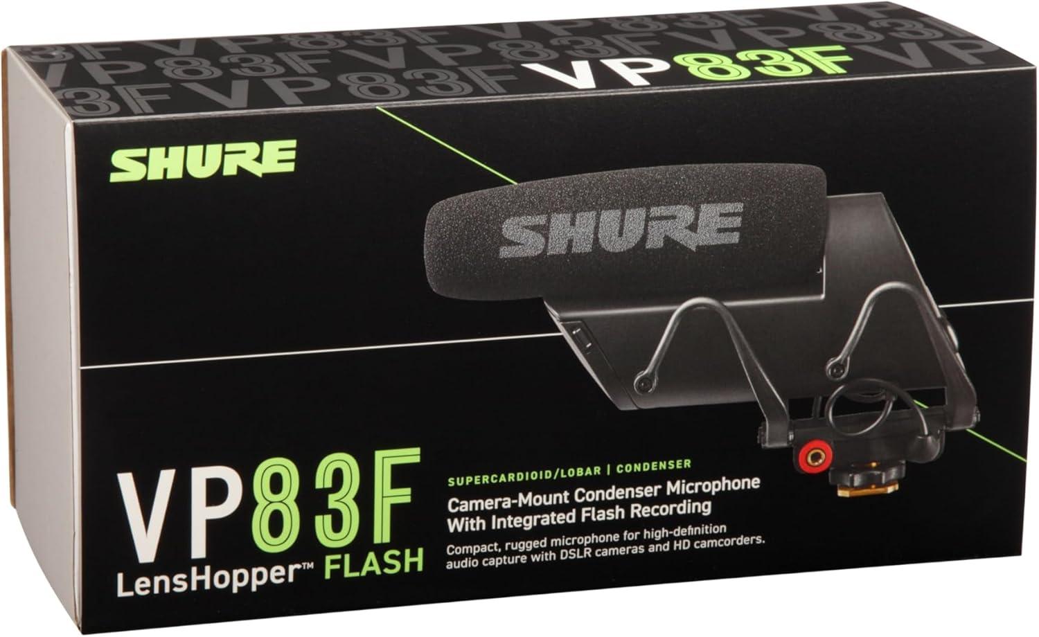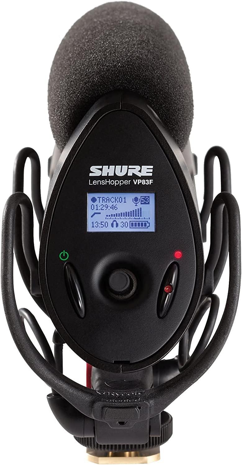 Shure VP83F LensHopper Camera-Mounted Condenser Shotgun Microphone with Integrated Digital Flash Recording – Windscreen, Superior RF Immunity, Backlit LCD, 5-Position Joystick, Rycote Lyre Shock Mount(Standard)