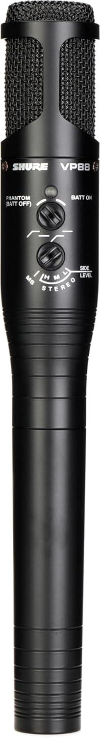 The Shure Model VP88 is a single-point, stereo condenser microphone for use in professional studio recording, field production, electronic news gathering (ENG), and studio broadcasting applications. It combines two condenser cartridges in a single housing to create a stereo audio image of the sound source. It is unique in its ability to capture the realism of a live event and yet withstand rigorous field production environments.